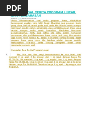 Contoh Soal Pertidaksamaan Linear Kelas 7. Suatu pertidaksamaan tidak akan berubah nilainya apabila ditambahkan atau dikurangkan dengan bilangan yang sama. Home » » CONTOH SOAL DAN PEMBAHASAN TENTANG PROGRAM LINEAR.
