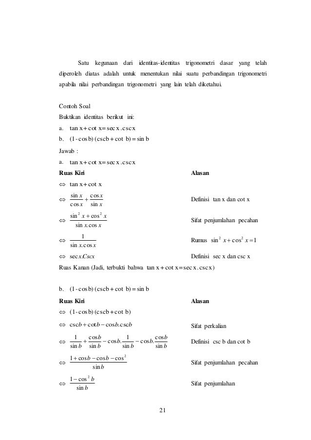 Contoh Soal Aturan Lhospital Trigonometri. Turunan fungsi trigonometri yaitu proses matematis untuk menemukan turunan pada suatu fungsi trigonometri ataupun tingkat perubahan terkait dengan suatu variabelnya. Pembahasan: Sebelumnya perlu diingat dulu identitas trigonometri berupa: Jawaban: D.